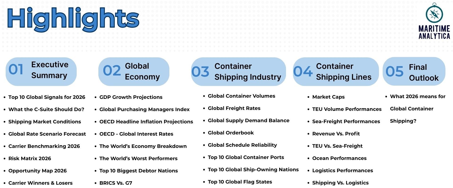 A 42-page, data-driven Global Container Shipping Outlook 2026 — including macro forecasts, freight rate scenarios, capacity analysis, carrier strategies, trade lane insights, risk maps, and strategic signals.